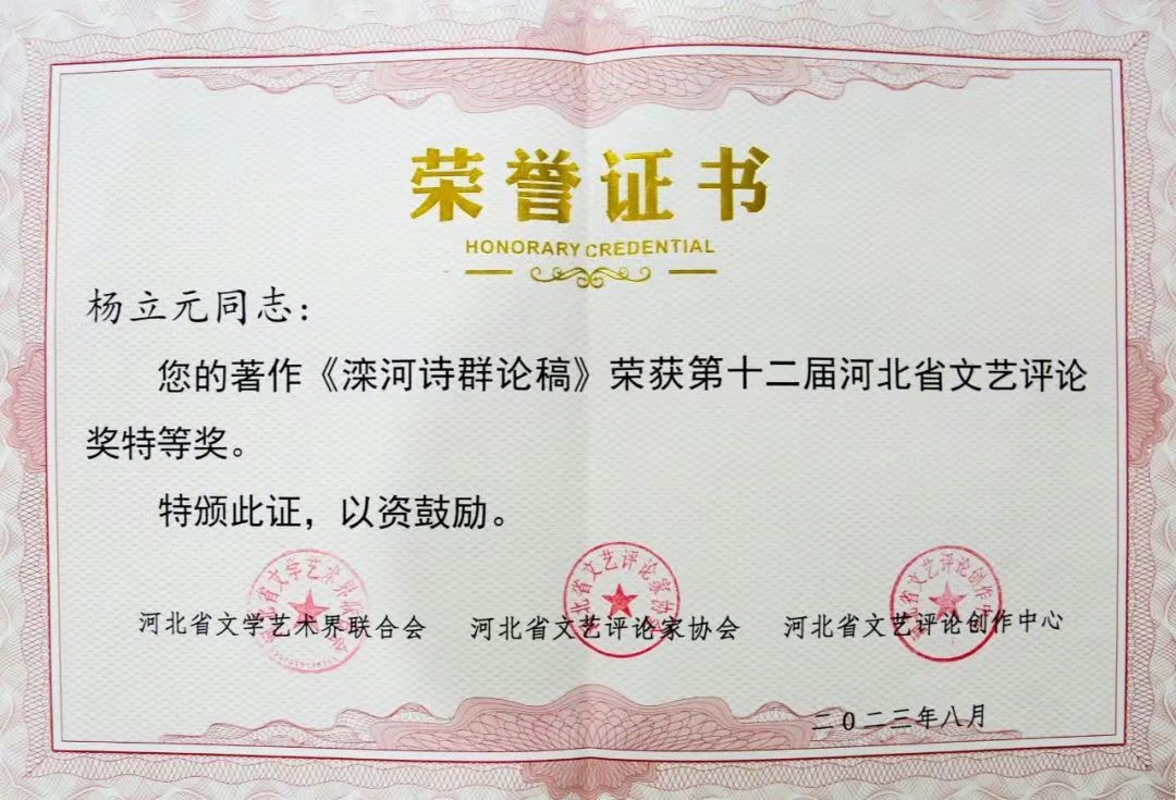 近日,我校文學(xué)院楊立元教授的評論專著《灤河詩群論稿》獲第十四屆河北省文藝振興獎(jiǎng)。河北省文藝振興獎(jiǎng)是河北省委、省政府設(shè)立的文藝類省級獎(jiǎng),旨在表彰在文藝創(chuàng)作、演出、評論、研究等方面取得突出成績的文藝工作者和團(tuán)體,目前該獎(jiǎng)項(xiàng)每五年評選一次。自“文藝振興獎(jiǎng)”設(shè)立以來,對河北文藝創(chuàng)作的繁榮發(fā)展和文藝人才的發(fā)現(xiàn)培養(yǎng)產(chǎn)生了積極推動(dòng)作用。這是楊立元教授第三次獲得此獎(jiǎng)項(xiàng)。