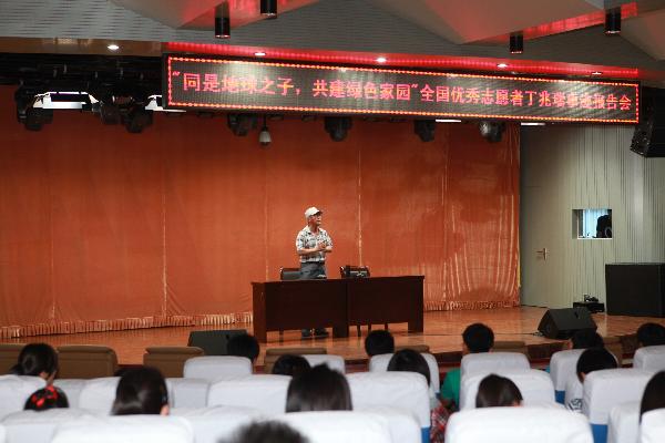 表彰大會結束后,被共青團省市委和媒體譽為中國綠色宣言倡導人地球之子丁兆瑞老師為我校師生作了一場以如何做好身邊的環保為主題的專題報告。號召當代大學生努力從身邊的小事做起,保護好我們的生存環境。他說,在他所做的一千多次演講中,親自關掉的燈,超過二十多萬盞,環保其實很簡單,就是一個簡單的舉動。演講中,他一直用科學的環保行為和理念帶動現場所有人員做力所能及的環保行為,博得了現場師生的陣陣掌聲。