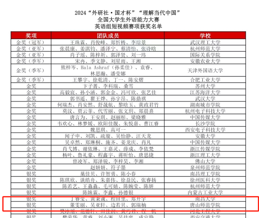我校外國語學院德語專業學生胡博雅獲得德語組銀獎、資源管理系學生孟子楊團隊和文學院學生董雯麗團隊均獲英語組短視頻賽項銀獎、外國語學院日語專業學生侯曉純獲得日語組銅獎、生命科學系學生劉雨薇獲得英語組國際傳播綜合能力賽項銅獎。
