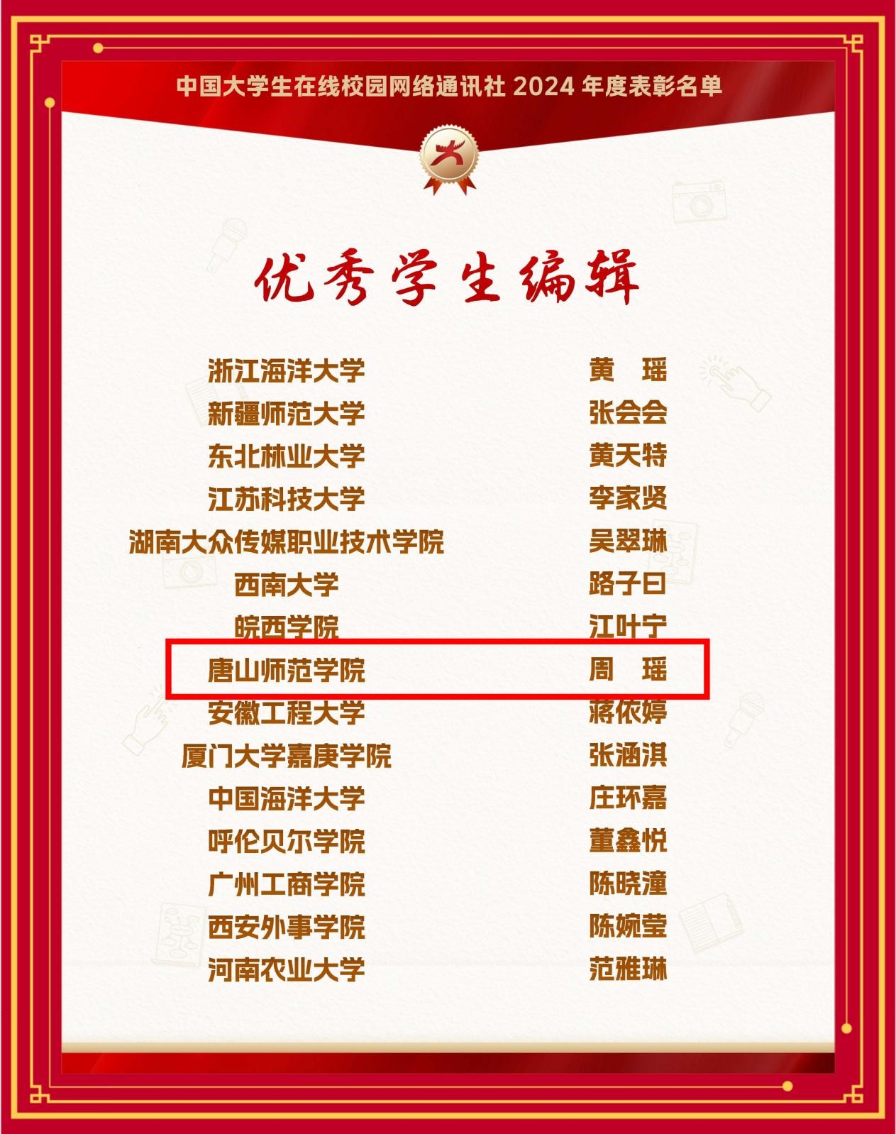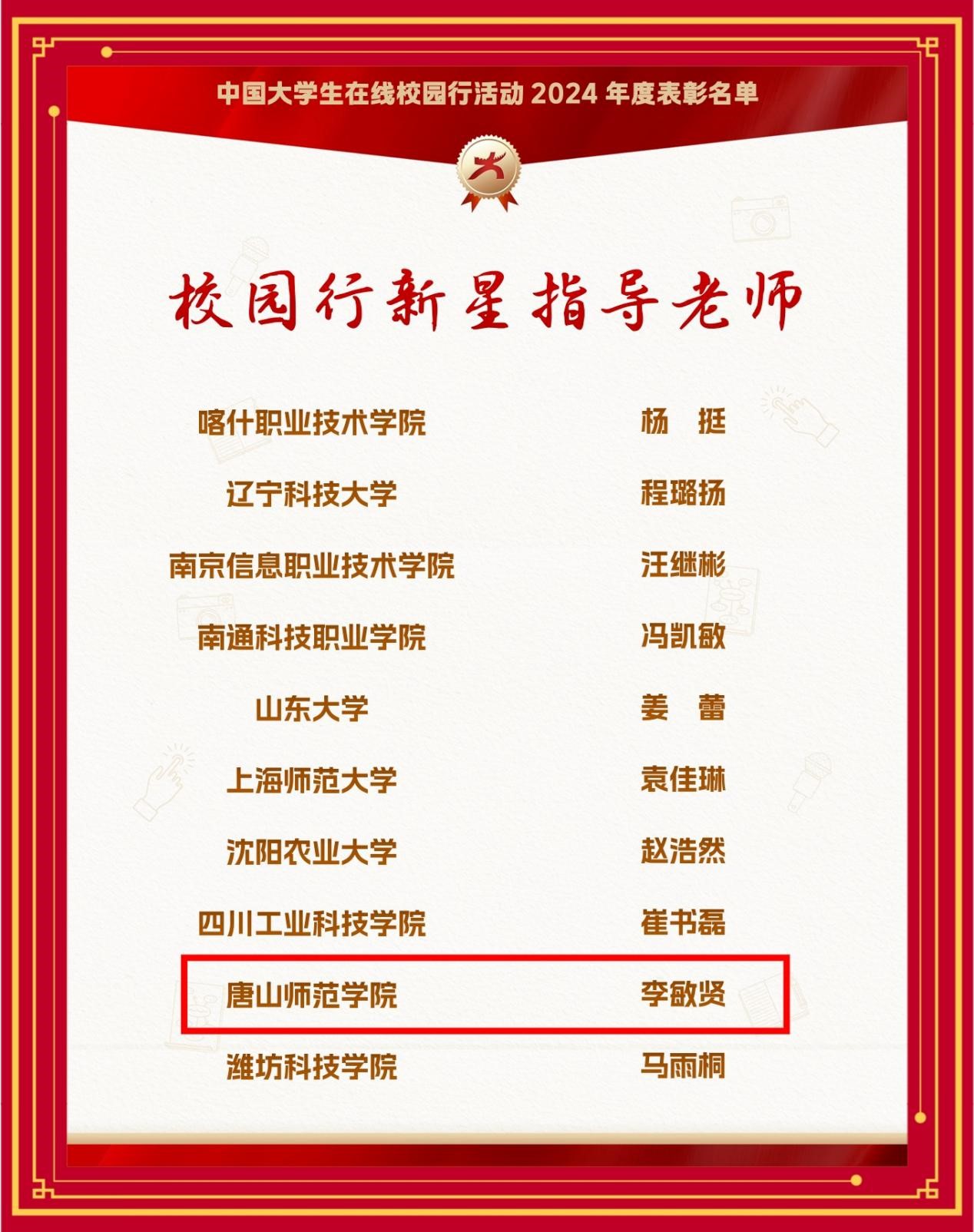近日,教育部中國大學生在線公布了2024年度中國大學生在線校網(wǎng)通及校園行活動表彰名單,我校連獲6大獎項。其中,我校榮獲教育部中國大學生在線評選的“2024年度優(yōu)秀校網(wǎng)通站”稱號,黨委學生工作部榮獲“2024校園行優(yōu)秀組織單位”,學生處李敏賢老師榮獲“優(yōu)秀指導教師”“2024校園行新星指導教師”,文學院周瑤同學榮獲“優(yōu)秀學生編輯”,我校所發(fā)布推文《開學第一課:上大學真的就輕松了嗎》入選“年度優(yōu)秀內容榜單”。