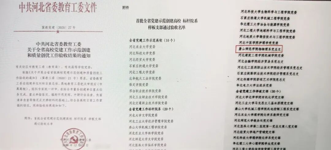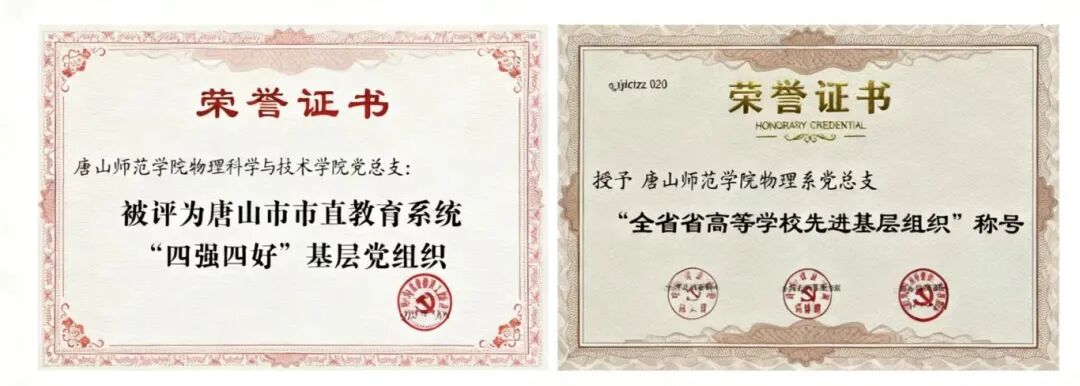 學院黨總支為河北省高校首批黨建工作標桿院系、河北省高等學校先進基層黨組織、河北省高校思想政治工作先進單位、唐山市教育系統“四強四好”基層黨組織、“四強四好”基層黨組織等基層黨建示范點;教師第一黨支部為河北省高校黨建工作樣板支部。