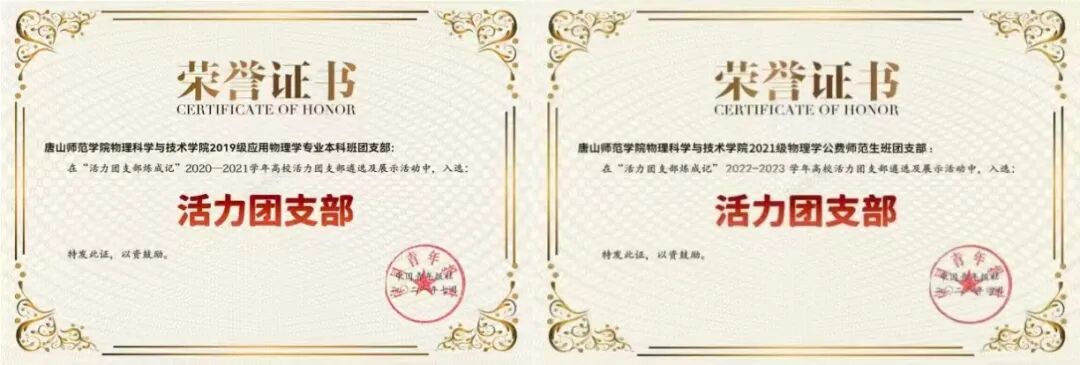 學院涌現出2個全國高校活力團支部。其中,2021級物理學公費師范生團支部“最具貢獻度”全國排名TOP4。2人被評為“中國大學生自強之星”,其中,張哲源同學受到了共青團中央的關注和贊揚,并被邀請擔任共青團中央“青年大學習”網上團課第七季第八期主持人。2019年12月16日“建設社會治理共同體”的專題團課在唐山錄制完成并上線,全國1700多萬名團員關注觀看,被共青團中央、河北共青團和搜狐等多家媒體報道。
