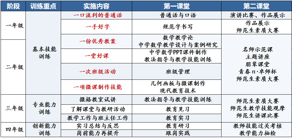 融合第一課堂與第二課堂資源,打造“理論學習+實踐體驗+榜樣引領”的立體化實踐平臺。定期舉辦“師德報告會”“名師示范課”,邀請中小學優秀教師、教學名師到校分享經驗,組織師范生觀摩學習;實施“朋輩計劃”,由高年級優秀學生結對指導低年級學生,形成“傳幫帶”成長氛圍;常態化開展“教學技能強化訓練”“教學技能過關考核”,每年舉辦“青春π?卓師杯”師范生素質大賽,覆蓋教學設計、模擬授課、課件制作、兩筆字、微課制作等核心環節,培養出一批“校級教學能手”。