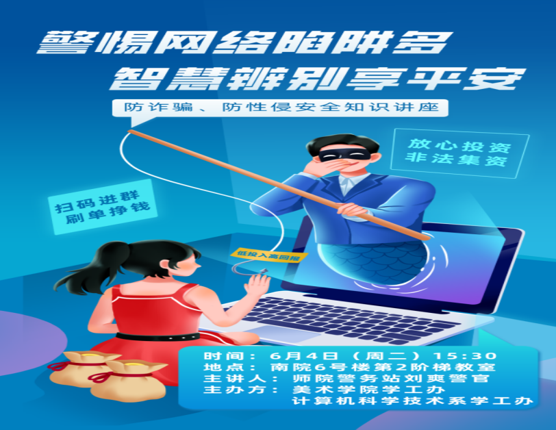 6月4日下午,我校舉辦了一場別開生面的安全知識講座,旨在提高學生們的網絡安全意識和自我保護能力,普及防詐騙和防性侵的安全知識。此次講座由美術學院與計算機科學技術系聯合主辦,共計師生150余人參加活動。