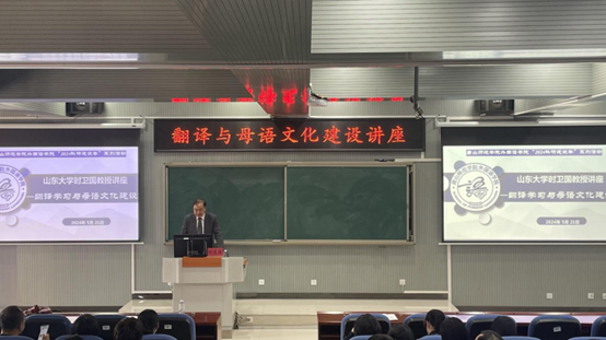 5月21日下午,外國語學院邀請山東大學特聘教授、博士生導師時衛國,在圖書館四層報告廳作題為“翻譯學習與母語文化建設”的專題講座。此次講座由外國語學院學科建設與科學研究委員會主任委員李旸教授主持,外國語學院全體教師和日語專業全體學生聆聽了講座。