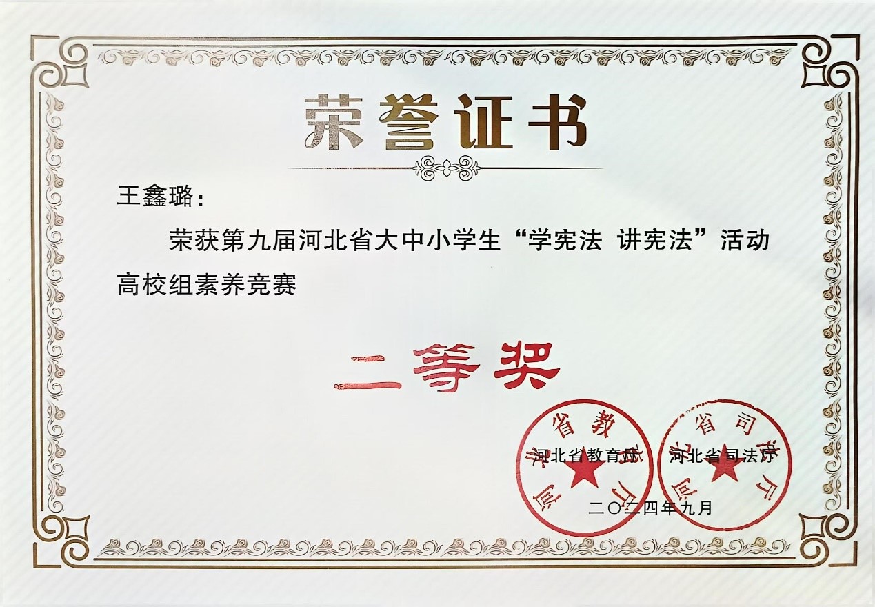 9月26日,由河北省教育廳、河北省司法廳主辦,河北師范大學(xué)承辦的第九屆河北省大中小學(xué)生“學(xué)憲法 講憲法”大賽暨全國選拔賽在石家莊成功舉行。我校歷史文化與法學(xué)系2023級法學(xué)專業(yè)王鑫璐同學(xué)在高校組素養(yǎng)競賽中榮獲二等獎,2024級法學(xué)專業(yè)肖懿桐同學(xué)在高校組演講比賽中榮獲二等獎。