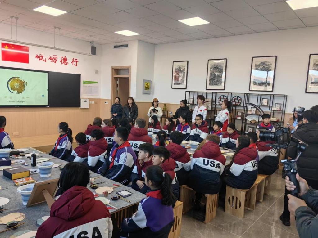 在比賽場館內(nèi),外國語學(xué)院的志愿者們協(xié)助工作人員完成裝備檢查及場地秩序維護。志愿者們陪同美國參賽隊隊員和其家庭,用英文講解中華優(yōu)秀傳統(tǒng)文化,并帶領(lǐng)美國青少年親手體驗寫“福”字等傳統(tǒng)活動。在賽事間隙,外國語學(xué)院志愿者們主動與外國滑冰選手展開友好互動,留下了一張張洋溢著青春笑容的合影。