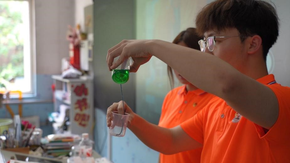 活動過程中,志愿者們精心準備的科普實驗瞬間點燃了孩子們的熱情。“移形換影”“流星雨”“飄舞的小動物”“泡沫噴泉”等一個個具有神奇現象、美輪美奐的化學小實驗,引發了小學生們的陣陣驚呼,現場氣氛一次次被推向高潮。