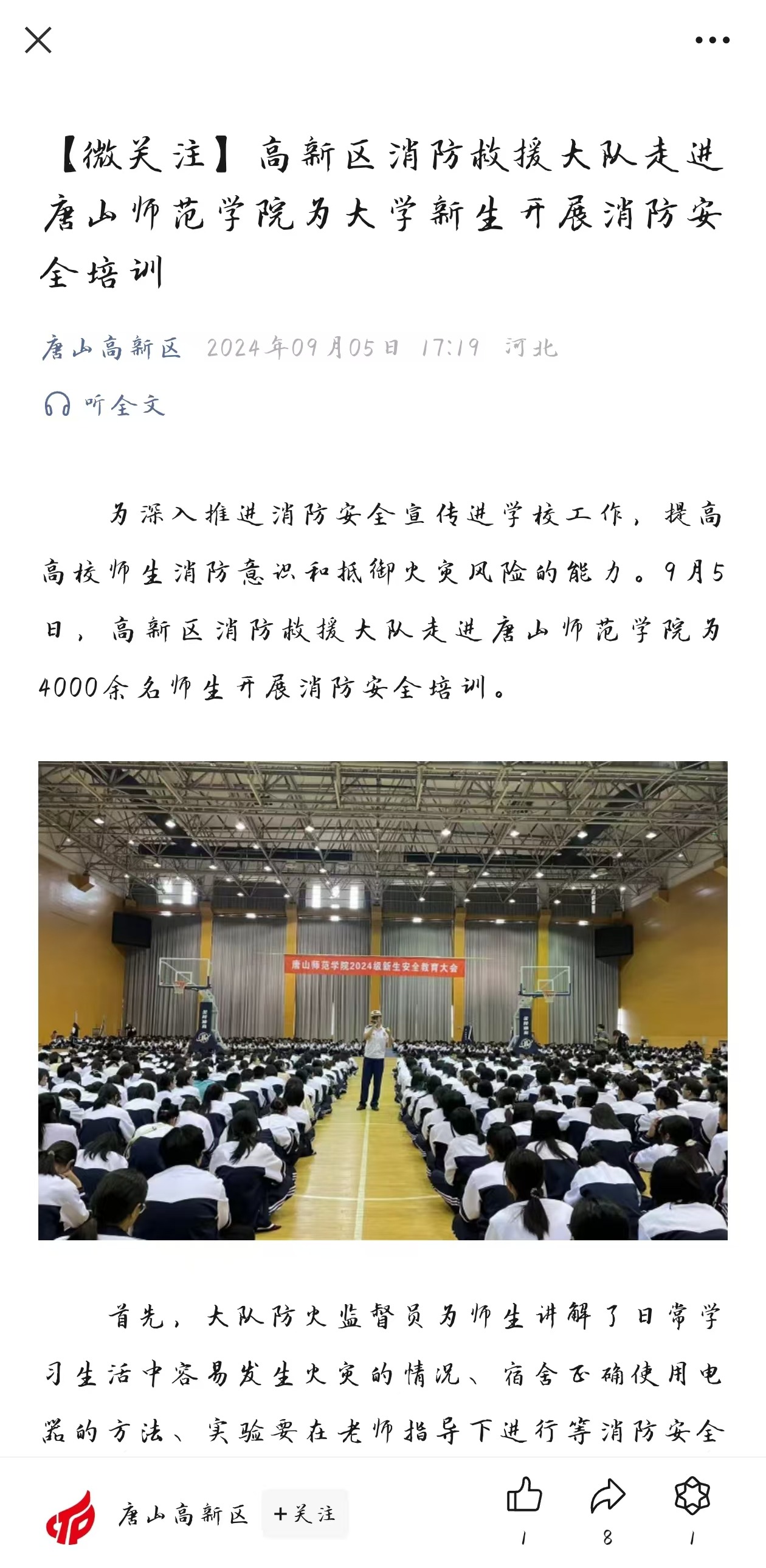 為深入推進消防安全宣傳進學校工作,提高高校師生消防意識和抵御火災風險的能力。9月5日,高新區消防救援大隊走進唐山師范學院為4000余名師生開展消防安全培訓。