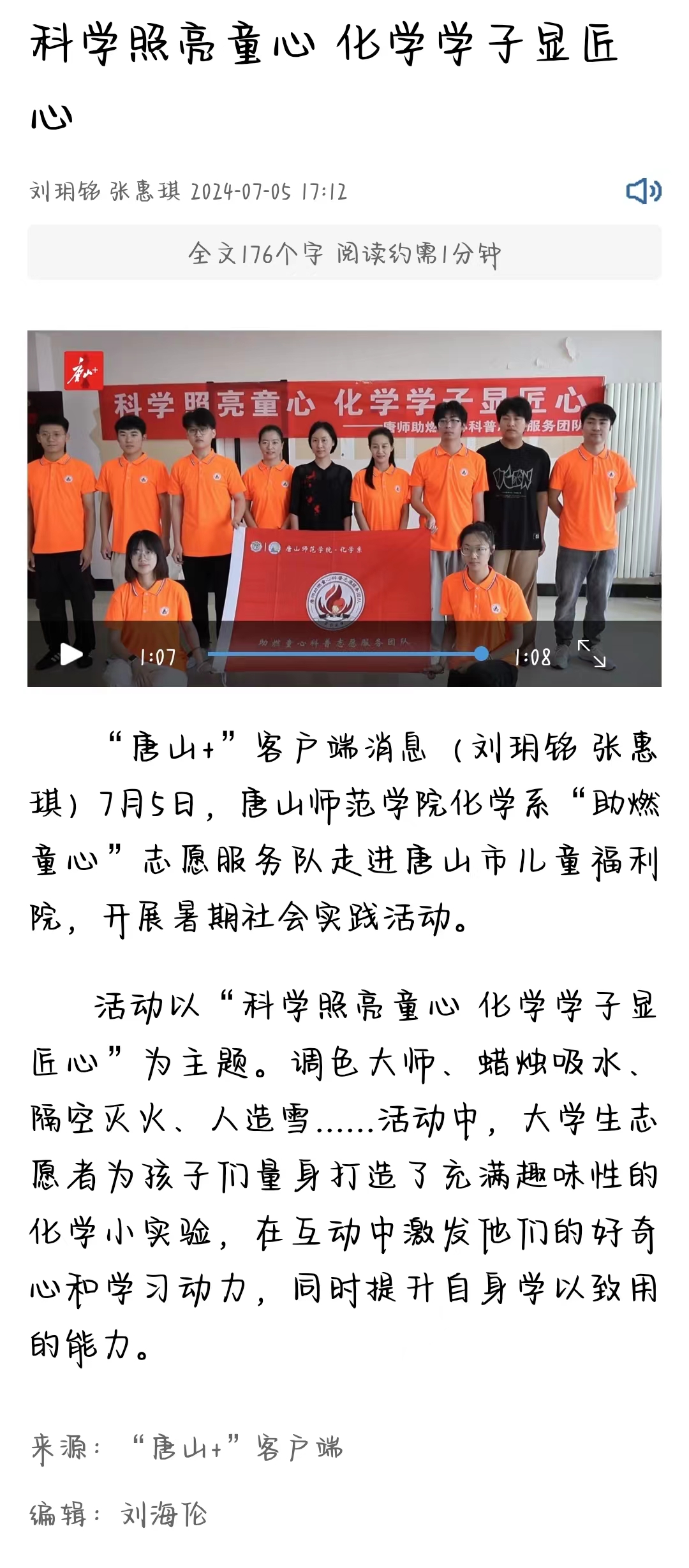 7月5日,唐山師范學(xué)院化學(xué)系“助燃童心”志愿服務(wù)隊(duì)走進(jìn)唐山市兒童福利院,開(kāi)展暑期社會(huì)實(shí)踐活動(dòng)。