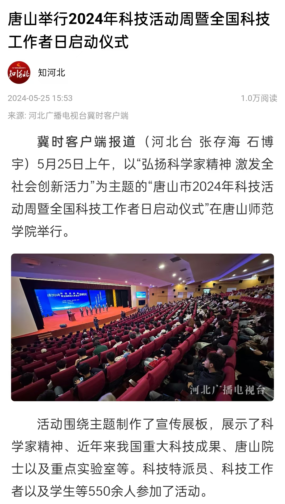 5月25日上午,以“弘揚科學家精神 激發全社會創新活力”為主題的“唐山市2024年科技活動周暨全國科技工作者日啟動儀式”在唐山師范學院舉行。