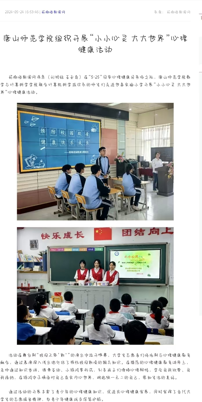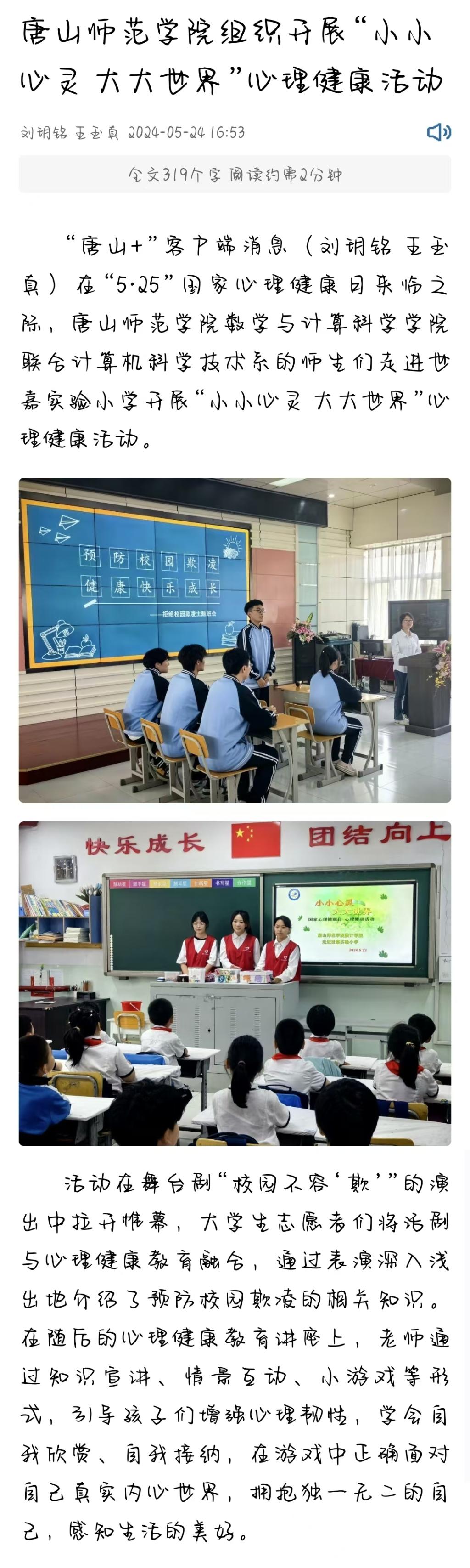 在“5·25”國家心理健康日來臨之際,為提升中小學生心理健康素養,促進學生全面發展,發揮當代大學生志愿服務精神,為青少年心理健康教育貢獻青春力量。日前,唐山師范學院數學與計算科學學院聯合計算機科學系組織師生來到世嘉實驗小學,開展了一場心理健康教育活動。