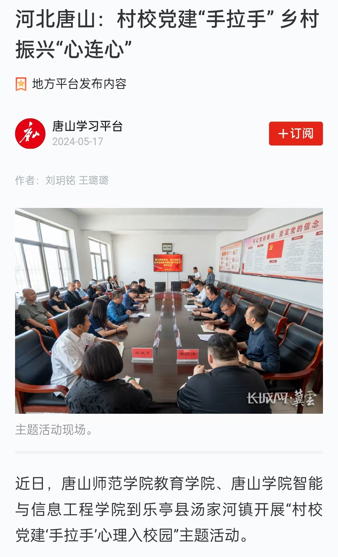 5月14日下午,唐山師范學院、唐山學院兩所高校與樂亭縣湯家河鎮開展“村校黨建‘手拉手’心理入校園”主題活動。