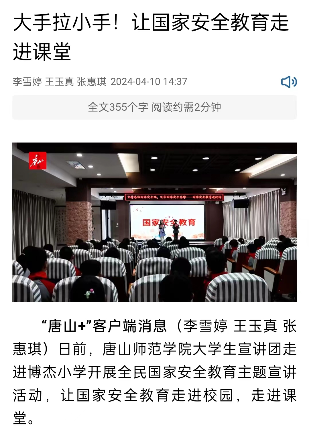 日前,唐山師范學院大學生宣講團走進博杰小學開展全民國家安全教育主題宣講活動,讓國家安全教育走進校園,走進課堂。