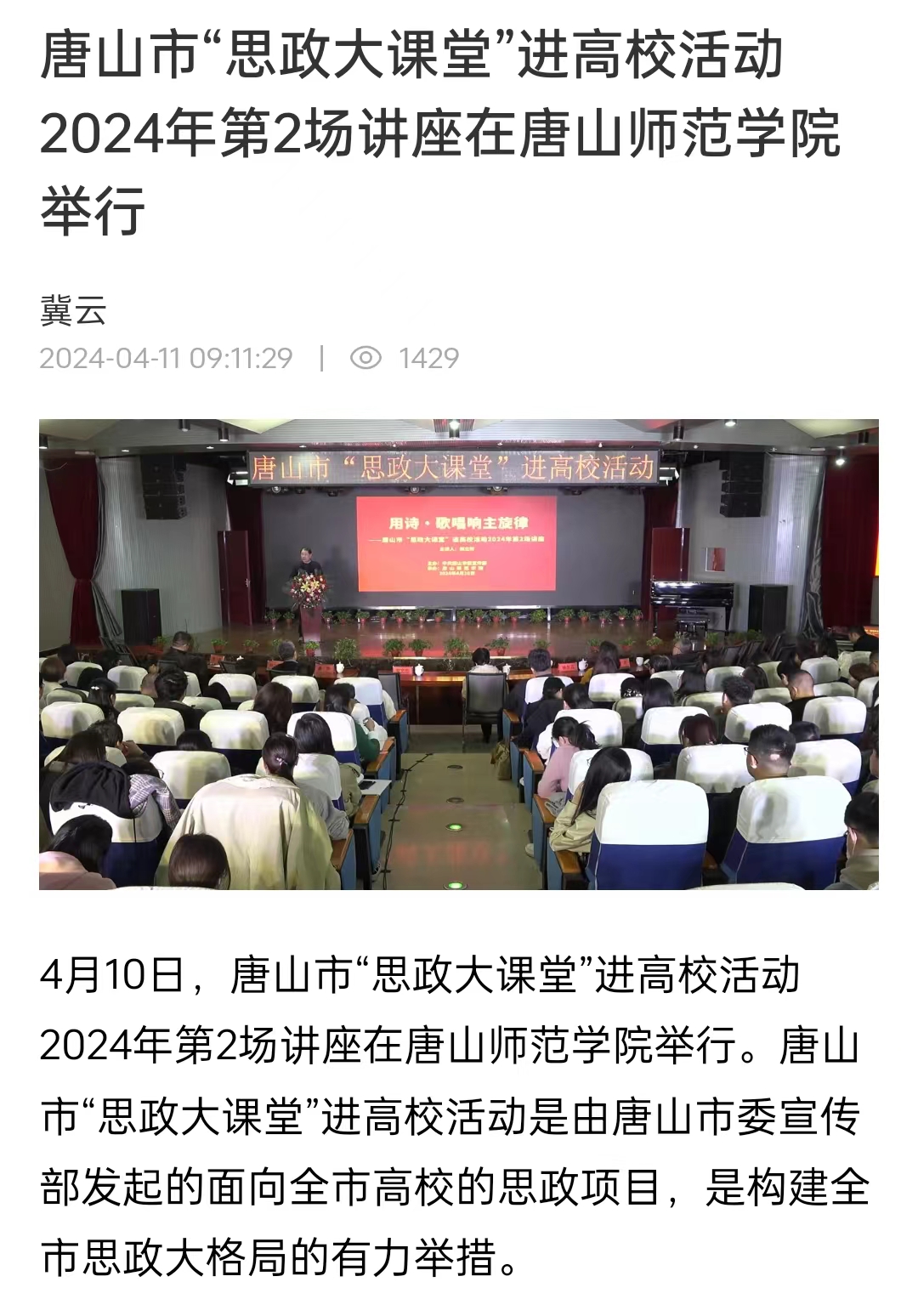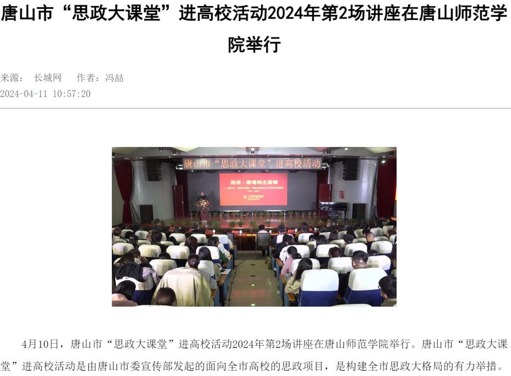4月10日,唐山市“思政大課堂”進高校活動2024年第2場講座在唐山師范學院舉行。唐山市“思政大課堂”進高校活動是由唐山市委宣傳部發起的面向全市高校的思政項目,是構建全市思政大格局的有力舉措。