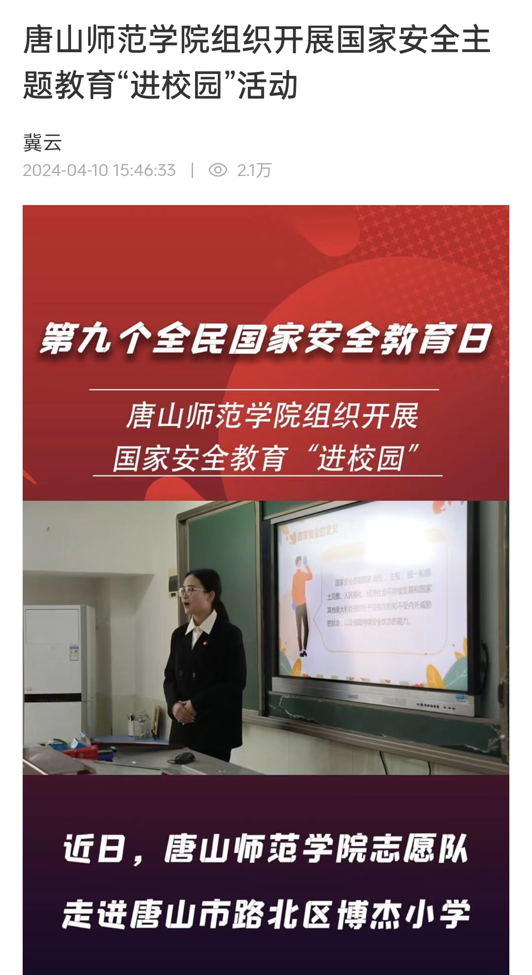 近日,唐山師范學(xué)院志愿隊走進唐山市路北區(qū)博杰小學(xué),組織開展“大手牽小手走近國家安全教育”活動,廣泛開展形式多樣、內(nèi)容豐富的國家安全宣傳教育,扎實推進國家安全教育“進校園”工作。