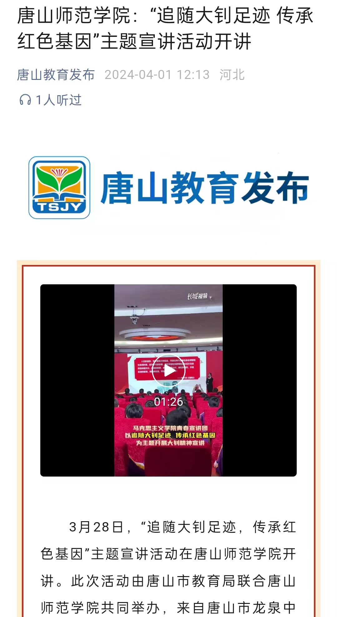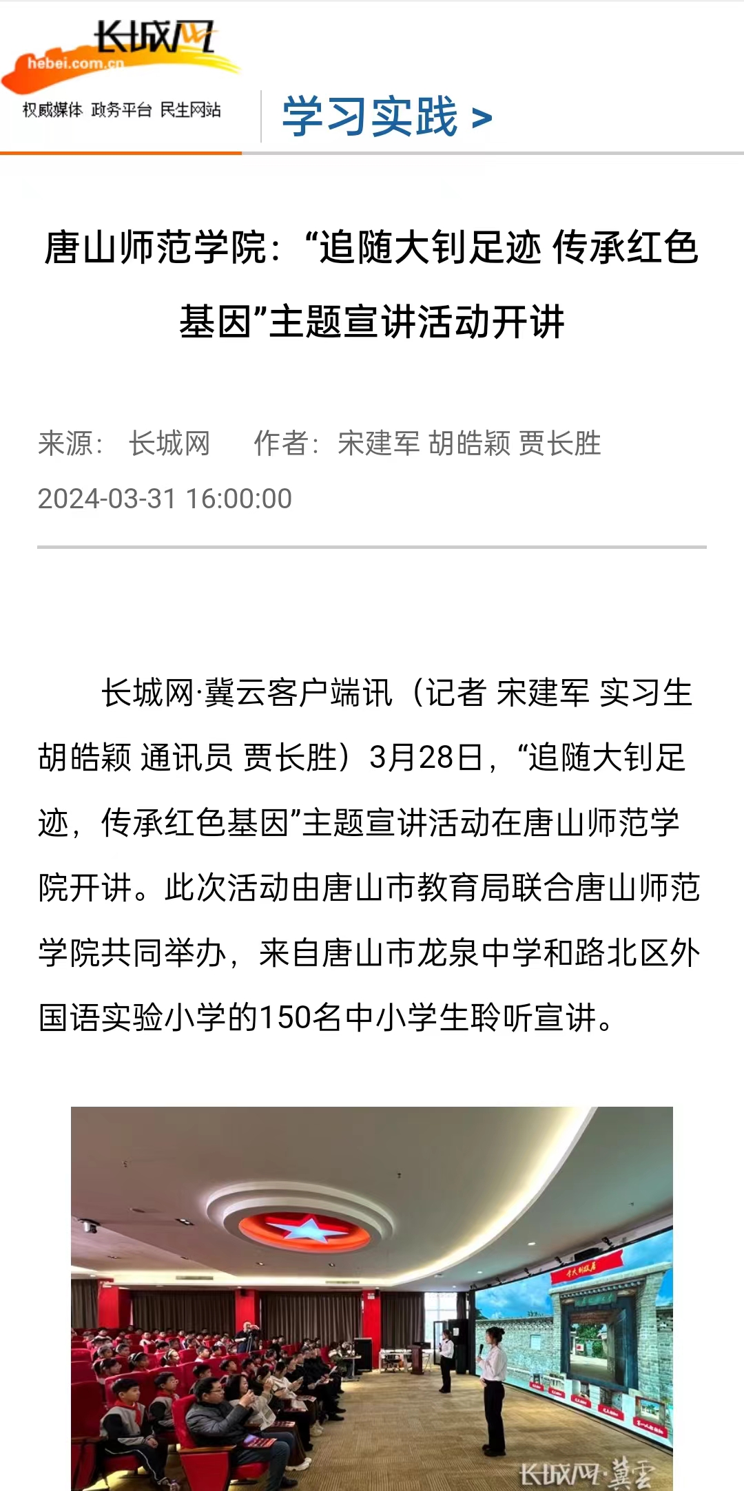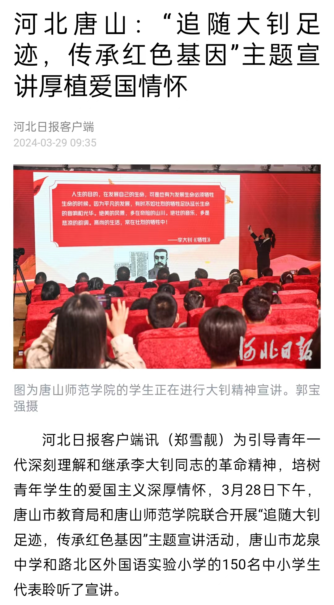 3月28日,“追隨大釗足跡,傳承紅色基因”主題宣講活動在唐山師范學院開講。此次活動由唐山市教育局聯合唐山師范學院共同舉辦,來自唐山市龍泉中學和路北區外國語實驗小學的150名中小學生聆聽宣講。