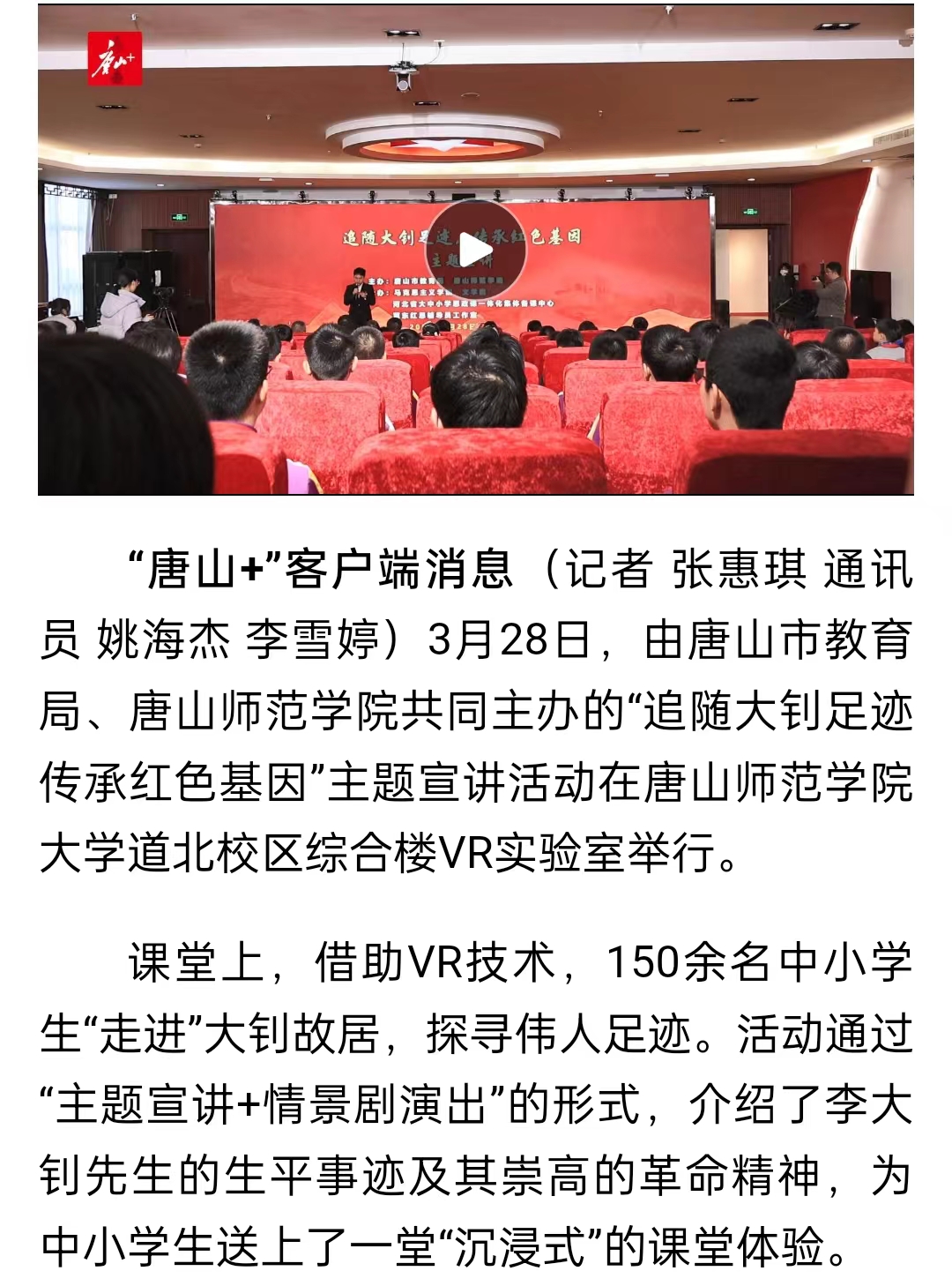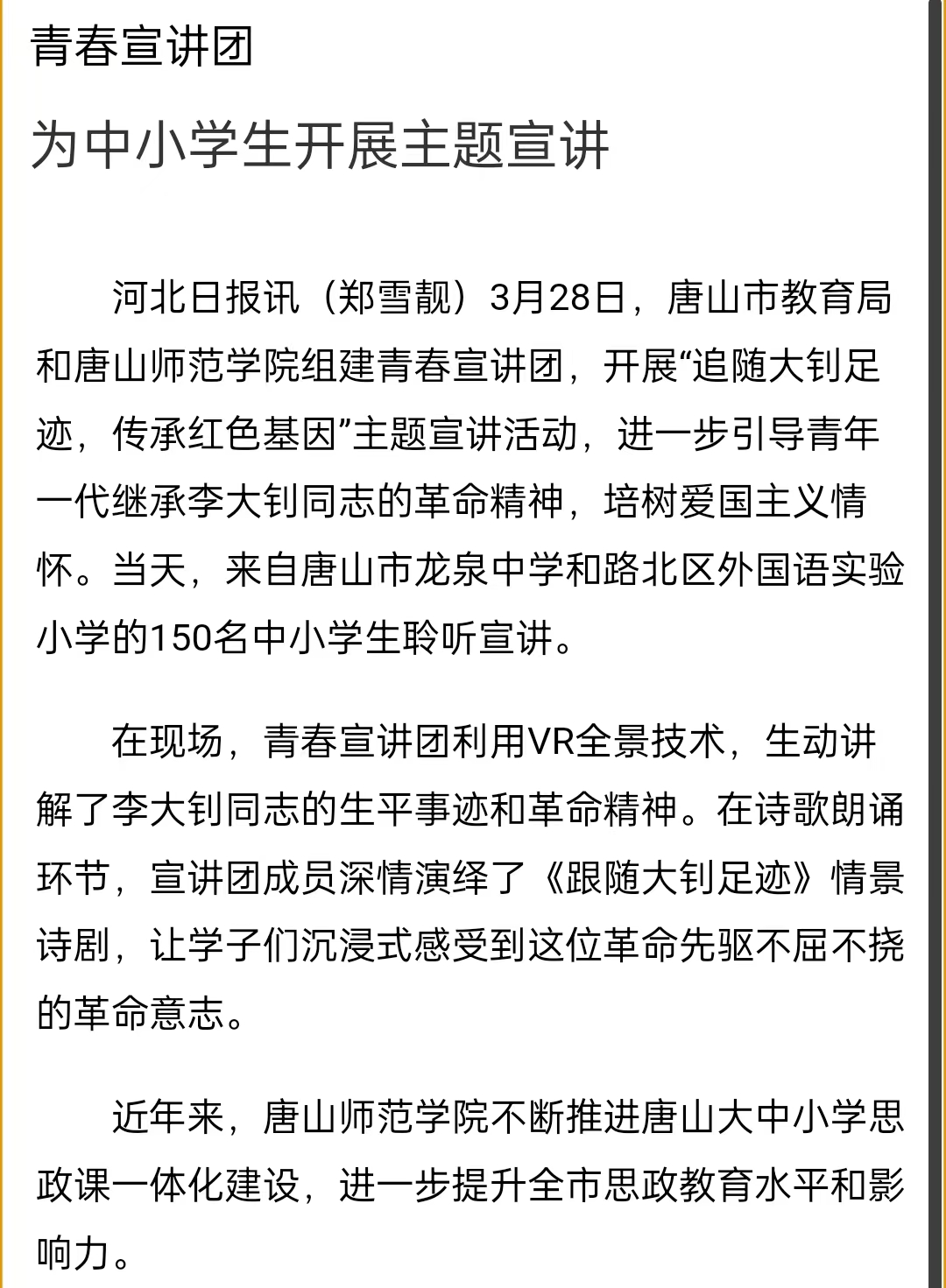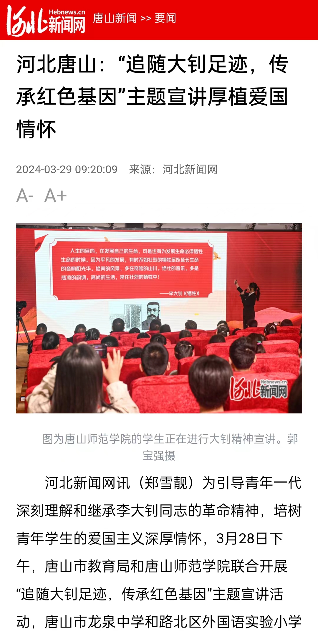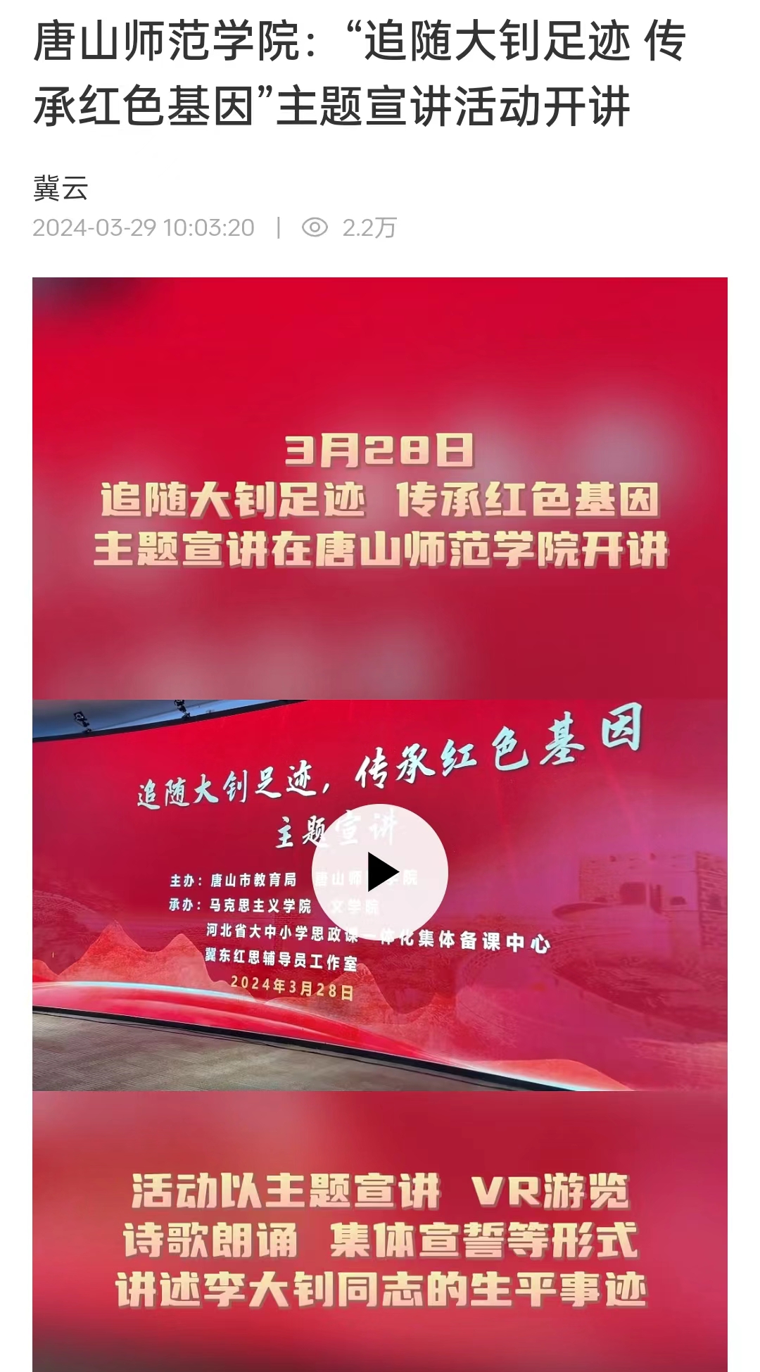 3月28日,“追隨大釗足跡,傳承紅色基因”主題宣講活動在唐山師范學院開講。此次活動由唐山市教育局聯合唐山師范學院共同舉辦,來自唐山市龍泉中學和路北區外國語實驗小學的150名中小學生聆聽宣講。