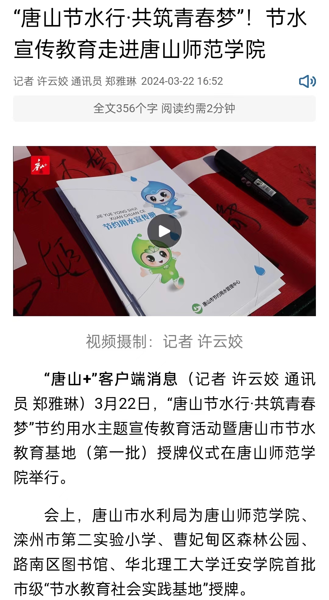 3月22日,由唐山市水利局、市教育局、市文明辦、市機關事務管理局聯合舉辦的“唐山節水行·共筑青春夢”節約用水主題宣傳教育活動暨唐山市節水教育基地(第一批)授牌儀式在唐山師范學院舉行。唐山師范學院就節水型高校建設工作作了典型發言,授牌儀式結束后,與會領導實地參觀了師范學院節水高校建設情況,師范學院師生代表參加活動。