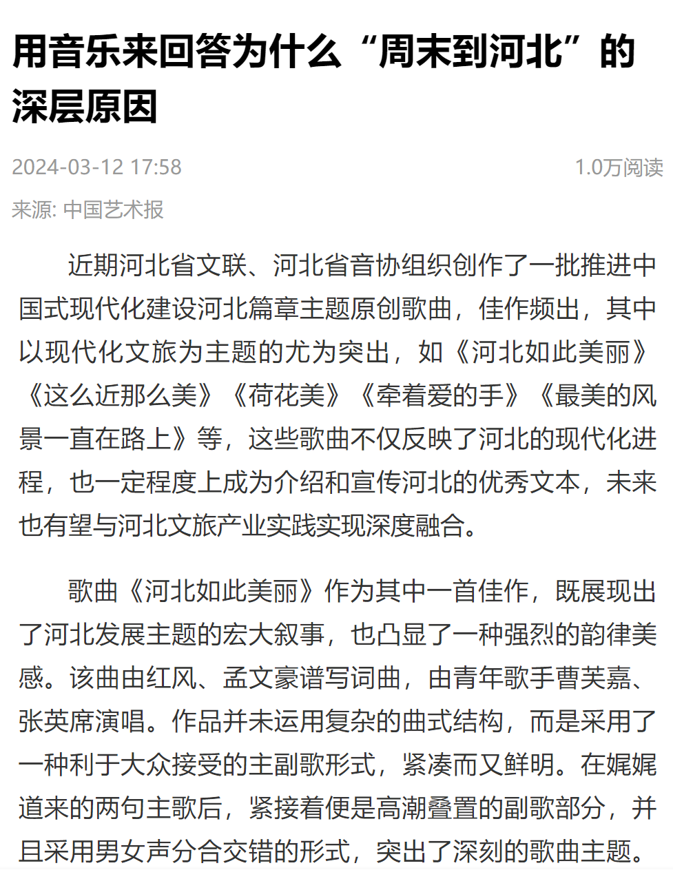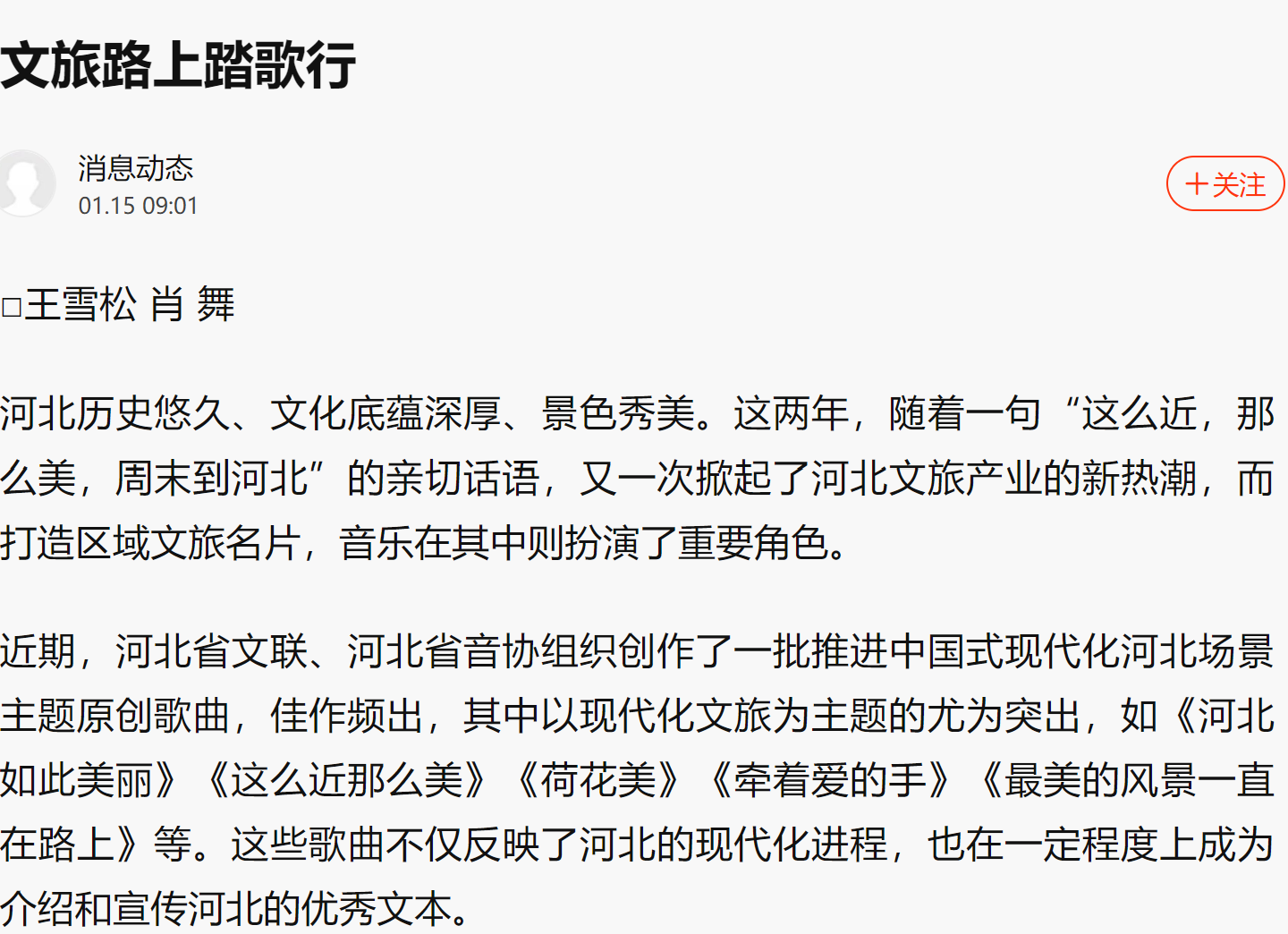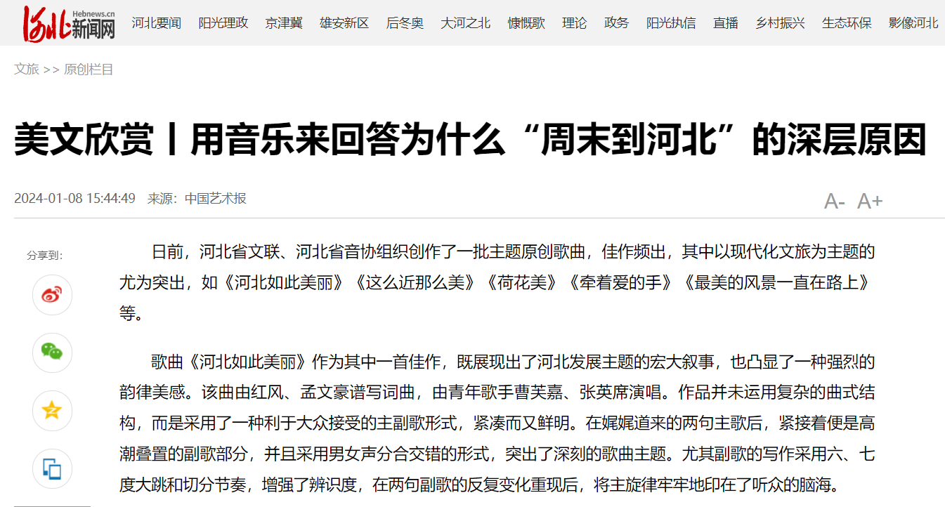 我校繼續教育學院王雪松老師在中國文藝網、中國藝術報、學習強國、河北新聞網、冀云、新浪新聞、冀時發布了《用音樂來回答為什么“周末到河北”的深層原因》的文章。