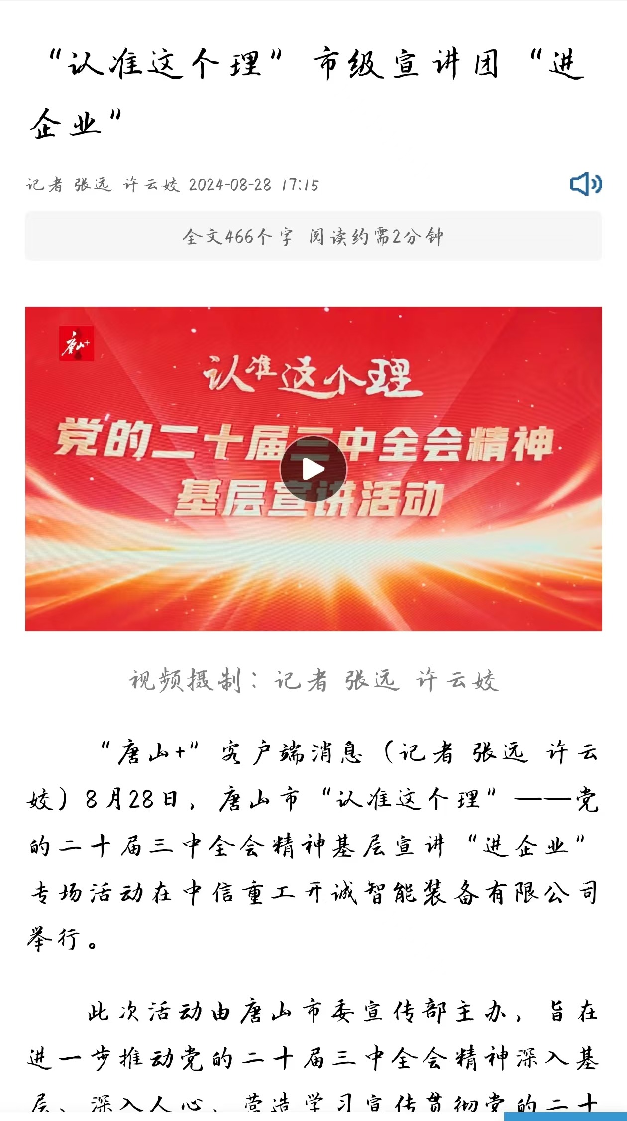 8月28日,唐山市“認(rèn)準(zhǔn)這個(gè)理”——黨的二十屆三中全會(huì)精神基層宣講“進(jìn)企業(yè)”專場(chǎng)活動(dòng)走進(jìn)中信重工開誠(chéng)智能裝備有限公司。唐山師范學(xué)院馬克思主義學(xué)院副院長(zhǎng)趙婉華參與宣講。