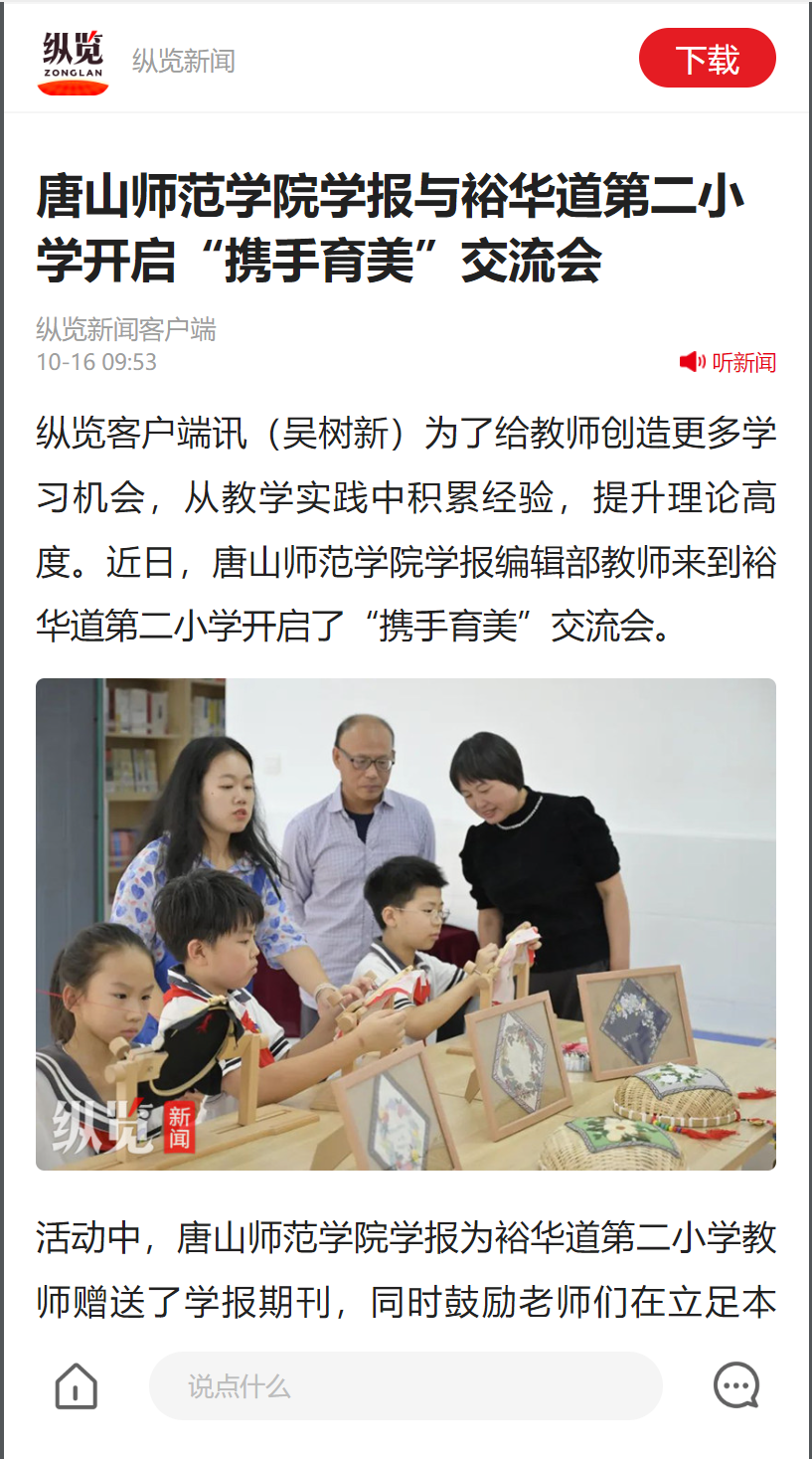 為了給教師創造更多學習機會,從教學實踐中積累經驗,提升理論高度。近日,唐山師范學院學報編輯部教師來到裕華道第二小學開啟了“攜手育美”交流會。