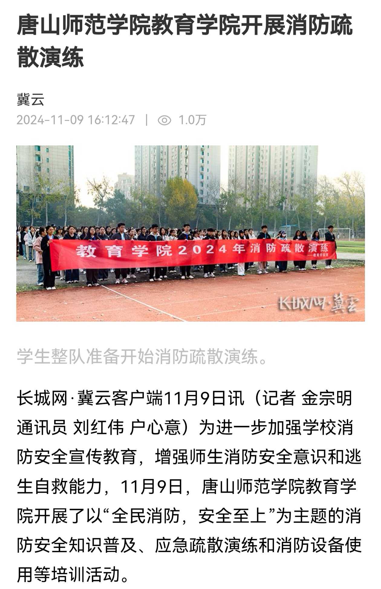為進一步加強學校消防安全宣傳教育,增強師生消防安全意識和逃生自救能力,11月9日,唐山師范學院教育學院開展了以“全民消防,安全至上”為主題的消防安全知識普及、應急疏散演練和消防設備使用等培訓活動。