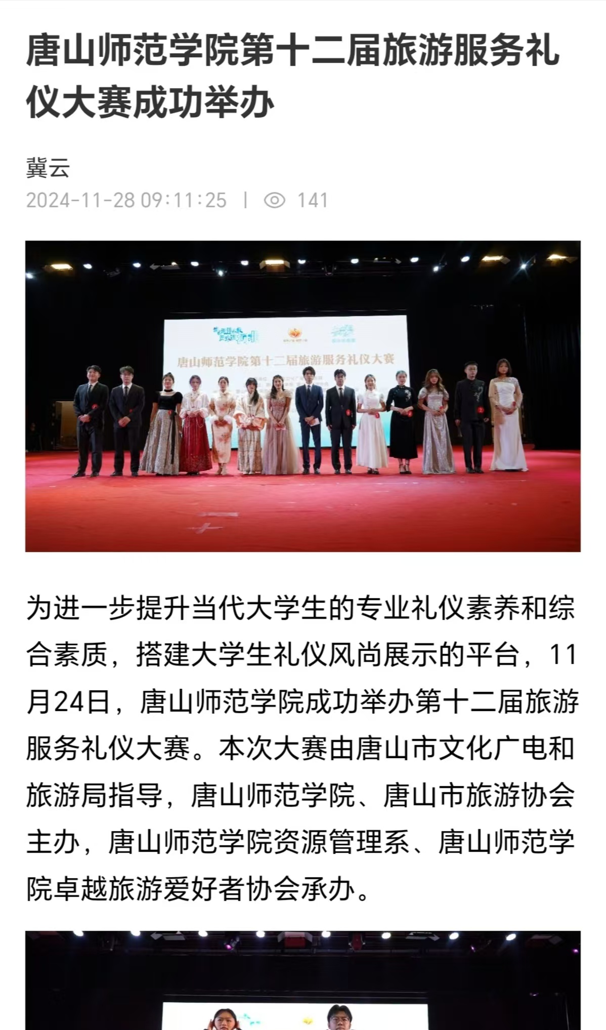 為進一步提升當代大學生的專業禮儀素養和綜合素質,搭建大學生禮儀風尚展示的平臺,11月24日,唐山師范學院成功舉辦第十二屆旅游服務禮儀大賽。本次大賽由唐山市文化廣電和旅游局指導,唐山師范學院、唐山市旅游協會主辦,唐山師范學院資源管理系、唐山師范學院卓越旅游愛好者協會承辦。