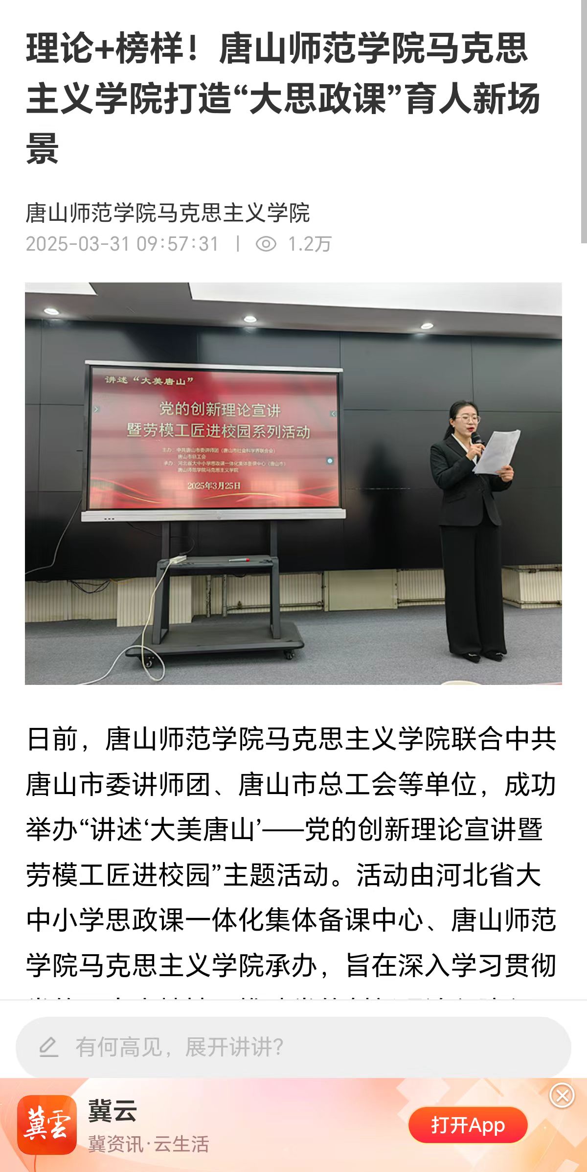 3月25日下午,講述“大美唐山”——黨的創(chuàng)新理論宣講暨勞模工匠進校園系列活動第二場宣講在唐山師范學院舉行,該校200余名師生代表參加。