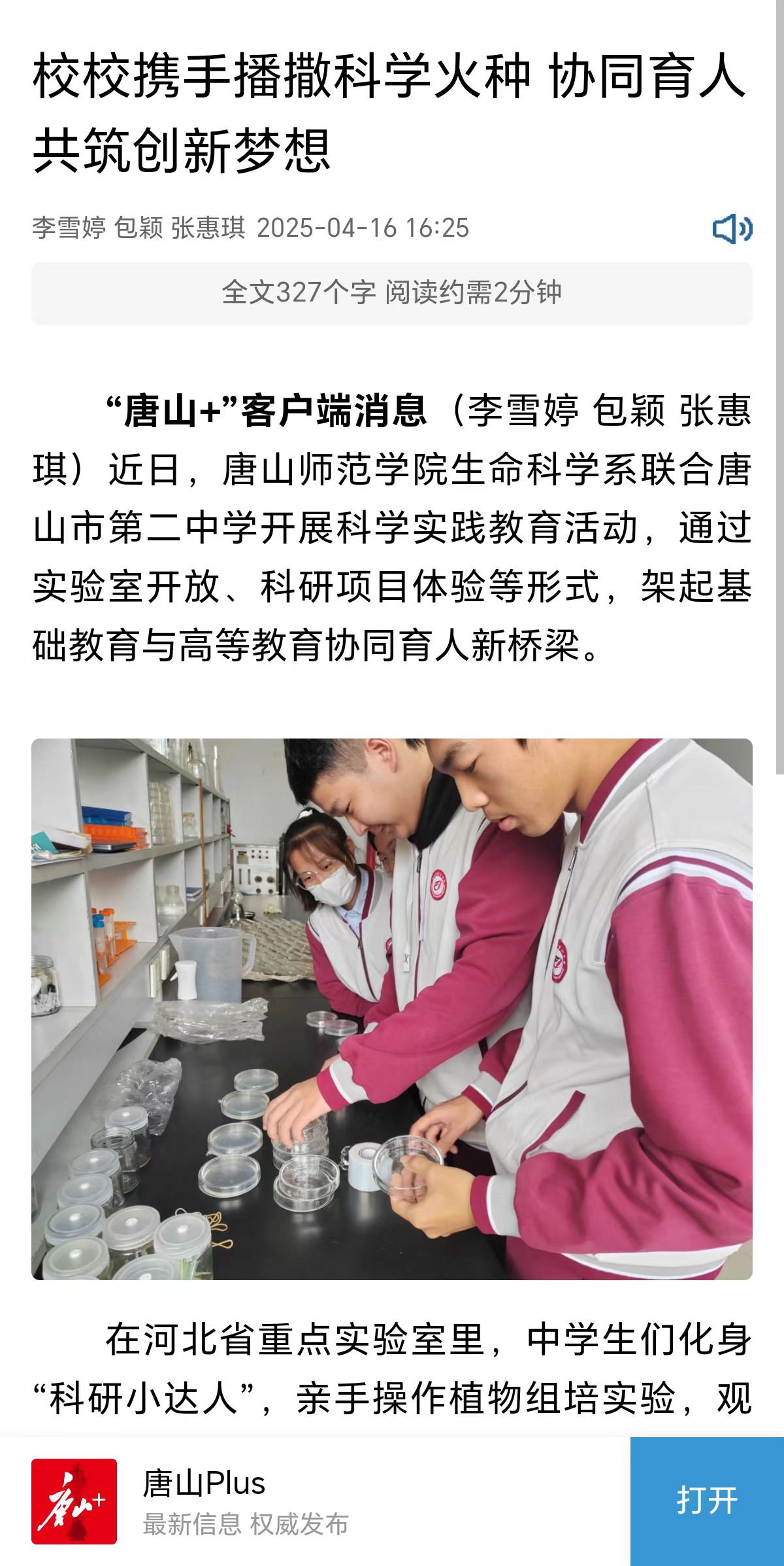 近日,唐山師范學院生命科學系聯合唐山市第二中學開展科學實踐教育活動,通過實驗室開放、科研項目體驗等形式,架起基礎教育與高等教育協同育人新橋梁。
