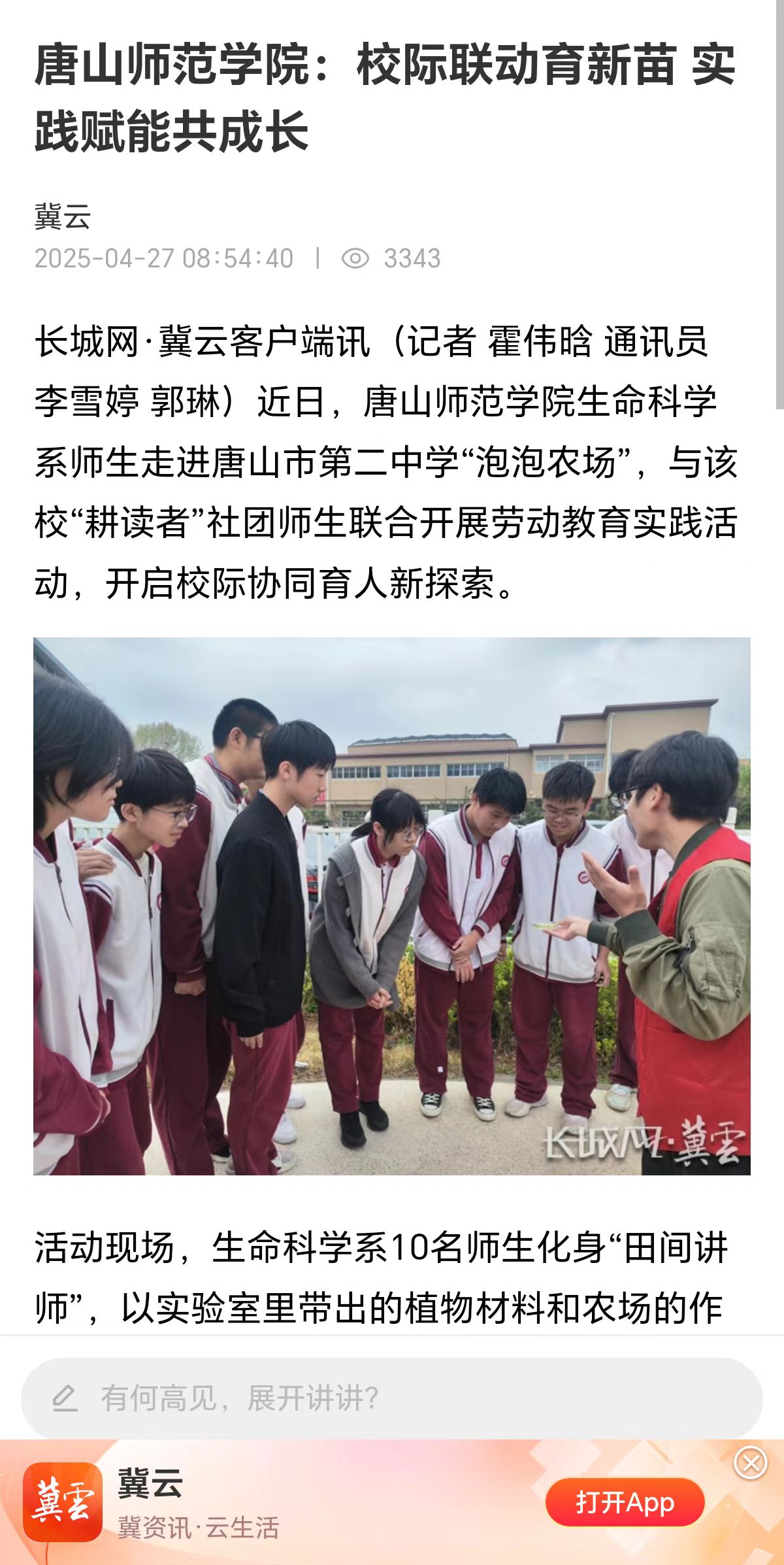 近日,唐山師范學(xué)院生命科學(xué)系師生走進(jìn)唐山市第二中學(xué)“泡泡農(nóng)場”,與該?!案x者”社團(tuán)師生聯(lián)合開展勞動教育實(shí)踐活動,開啟校際協(xié)同育人新探索。