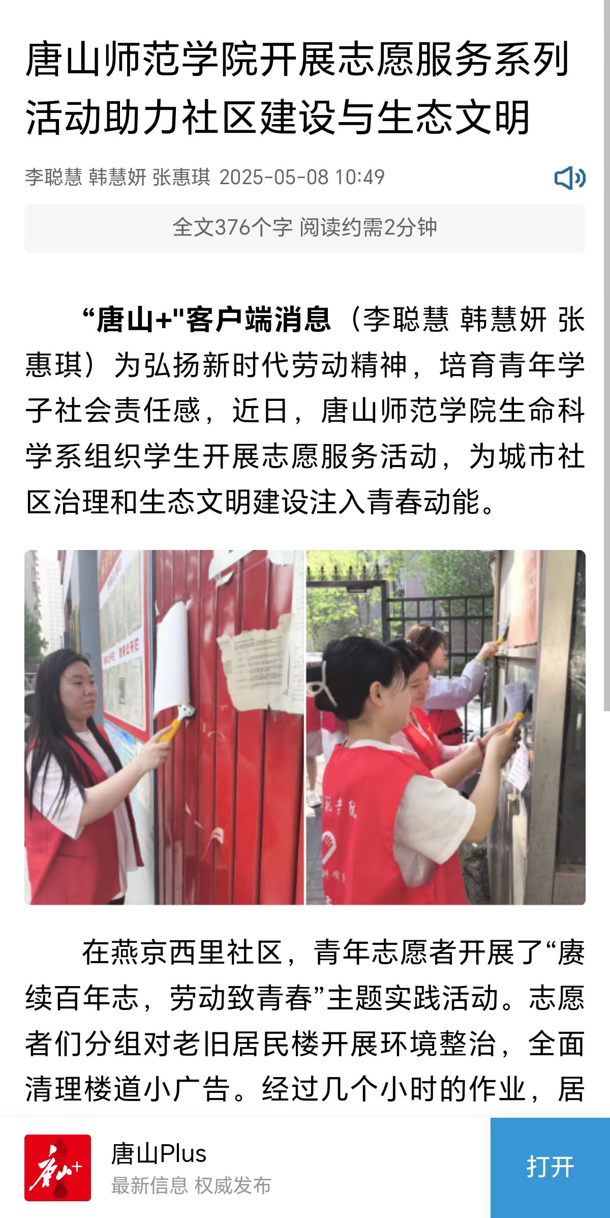 《環(huán)渤海新聞網(wǎng)》《唐山Plus》——唐山師范學(xué)院開展志愿服務(wù)系列活動(dòng)助力社區(qū)建設(shè)與生態(tài)文明