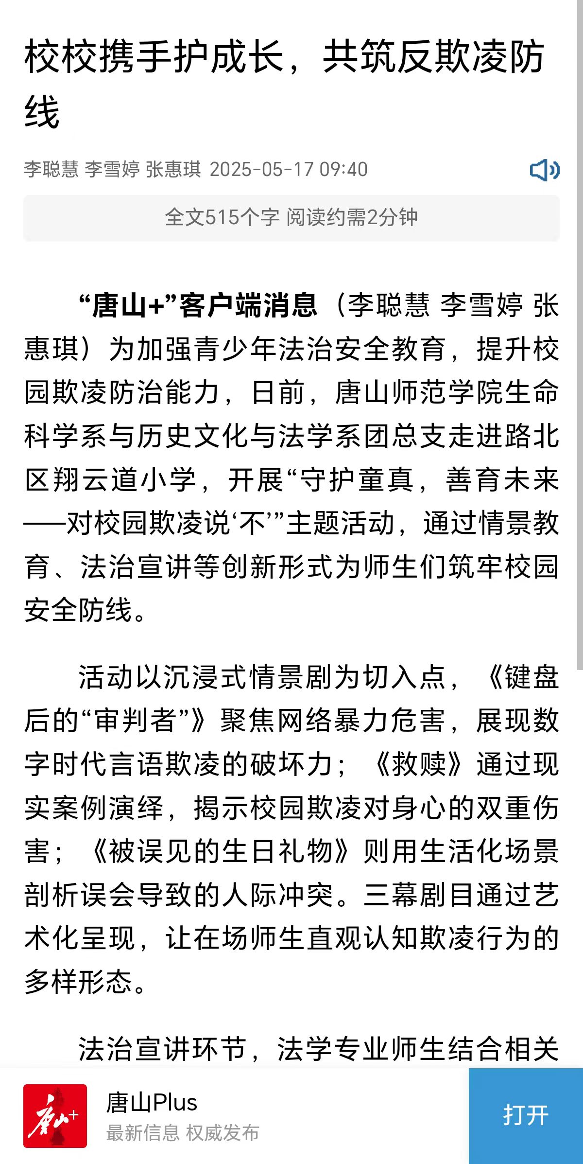 為加強青少年法治安全教育,提升校園欺凌防治能力,日前,唐山師范學院生命科學系與歷史文化與法學系團總支走進路北區翔云道小學,開展“守護童真,善育未來——對校園欺凌說‘不’”主題活動,通過情景教育、法治宣講等創新形式為師生們筑牢校園安全防線。