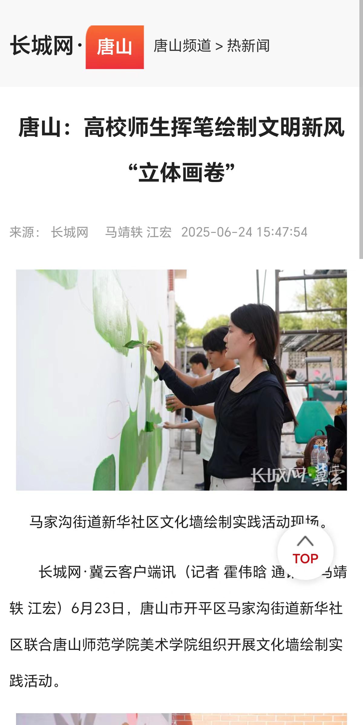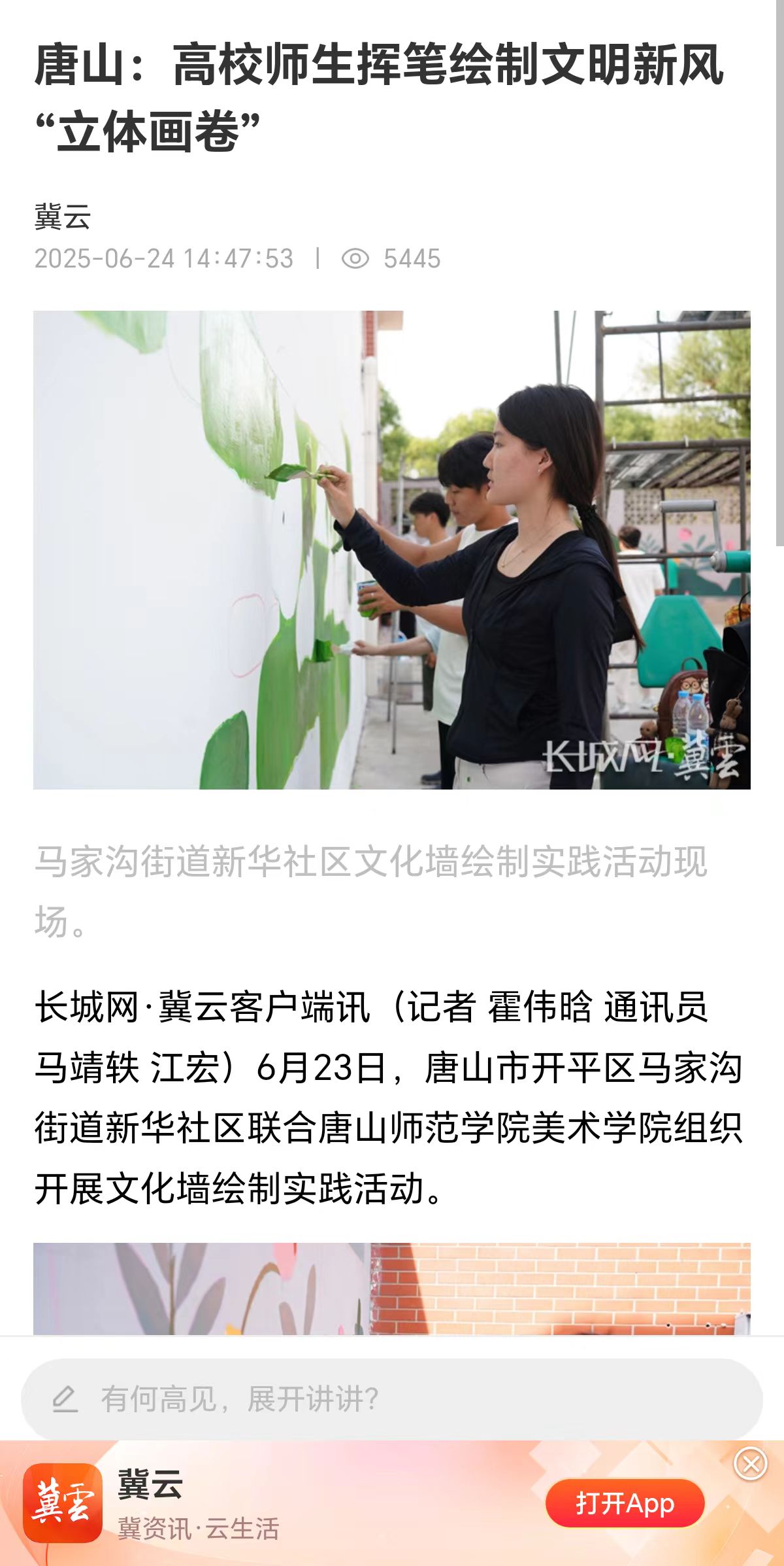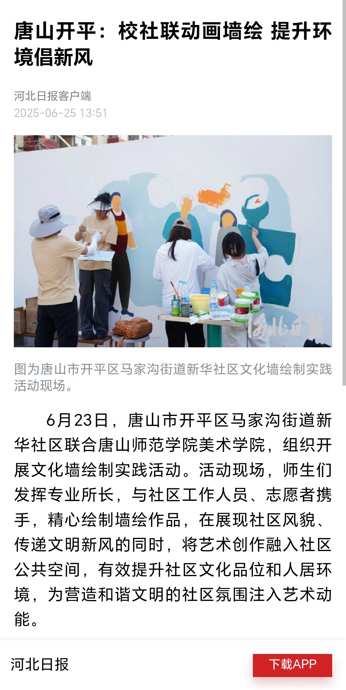 6月23日,唐山市開平區馬家溝街道新華社區聯合唐山師范學院美術學院,組織開展文化墻繪制實踐活動。